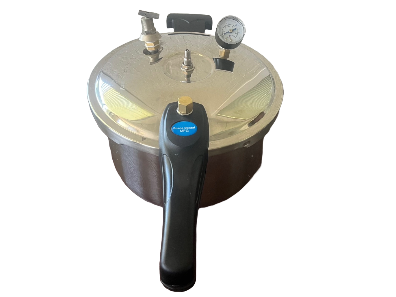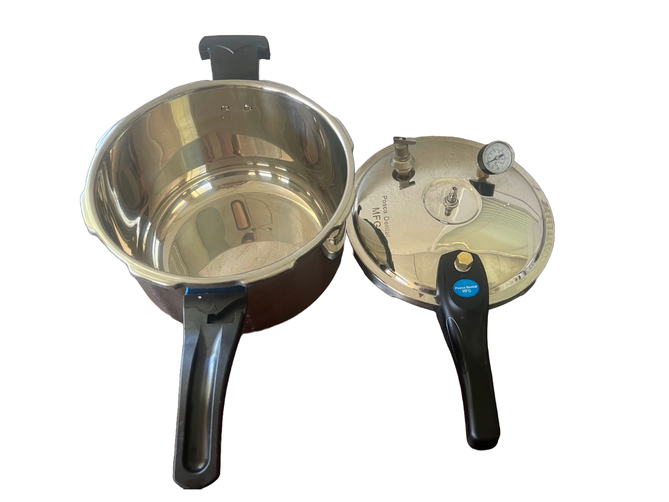 Our 8QT Pressure Pot is made out of stainless steel , this model does not have a heater. This model comes with a safety release valve ,air gauge reader , and a one year manufacture warranty. 6 Posca Pour Flasks fit in this pressure pot.