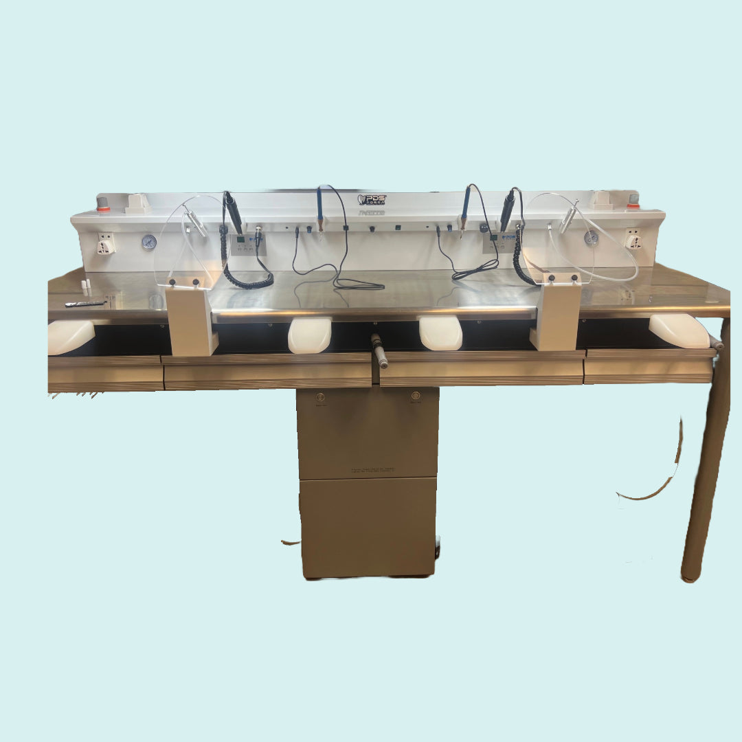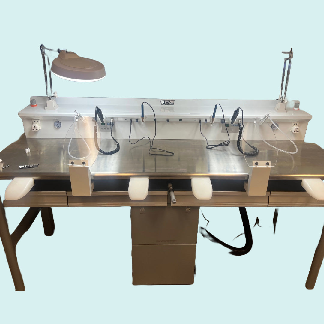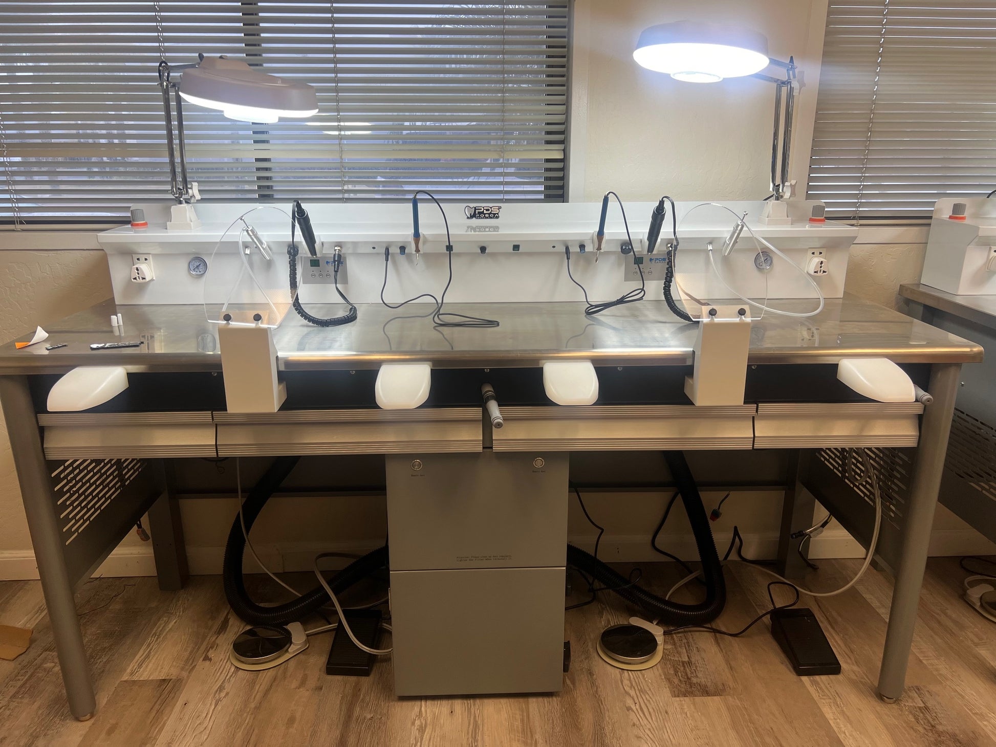 This double work top bench comes with a retractable air nozzle on both sides, 2 lights each with their own magnifying glass, 2 different foot pedals for controls on each side. Both sides are equipped with a vacuum, an air hook up, and electrical hook up.