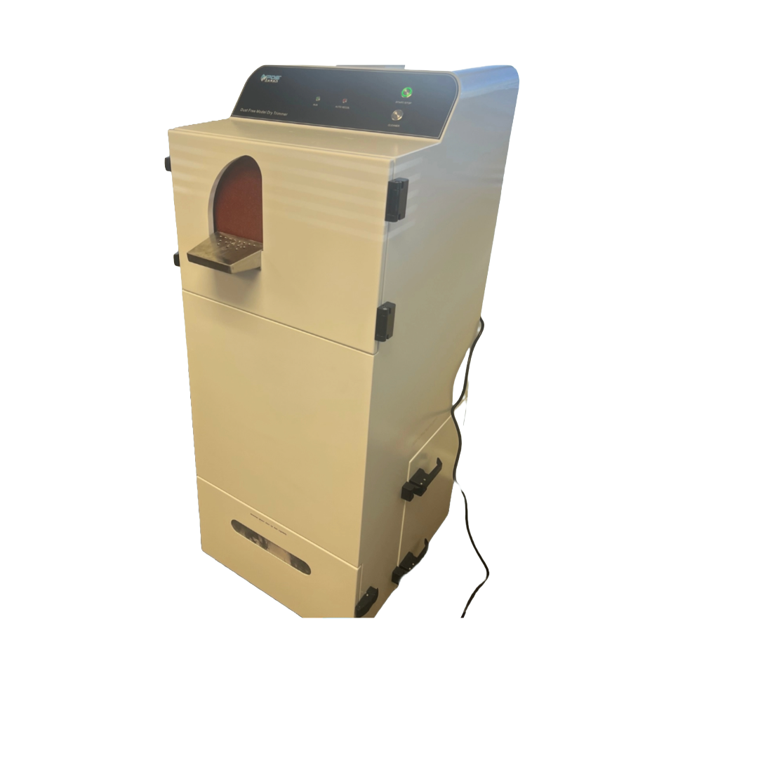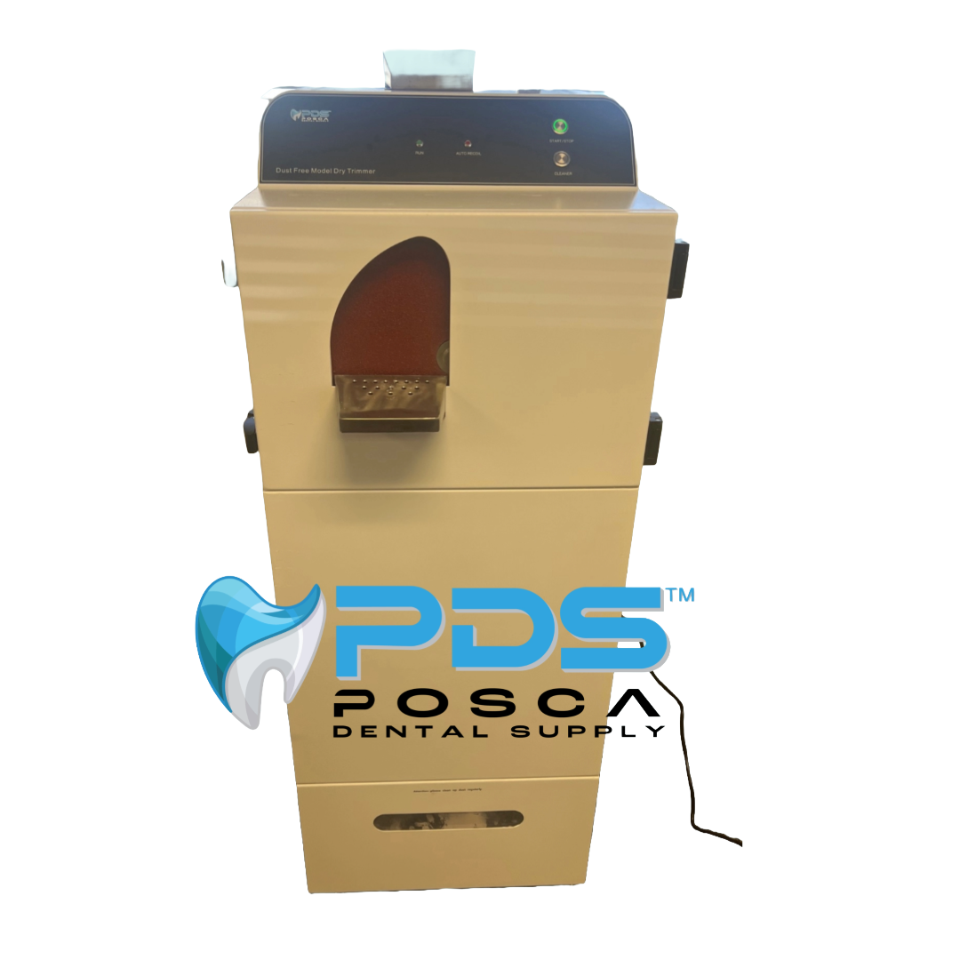 Introducing Posca Dental Supply’s Dry Model Trimming Machine – with automatic vacuum and built in automatic dust collector! High performance, fast and accurate trimming. Rigid cutting surface gives a flat, smooth finish. Dry trimming eliminates the clogs and messes! Easy change out of grinding disc – no screws necessary, this unit uses a strong Velcro. Unit comes with a 50 pack of grinding discs.2 easy Interchangeable Adjustable worktables – one for flat, one for an angle. This high-power unit is on wheels and is easily movable within your lab. This unit comes in 110 or 220 and will need an air hook up for easy, automatic cleaning.