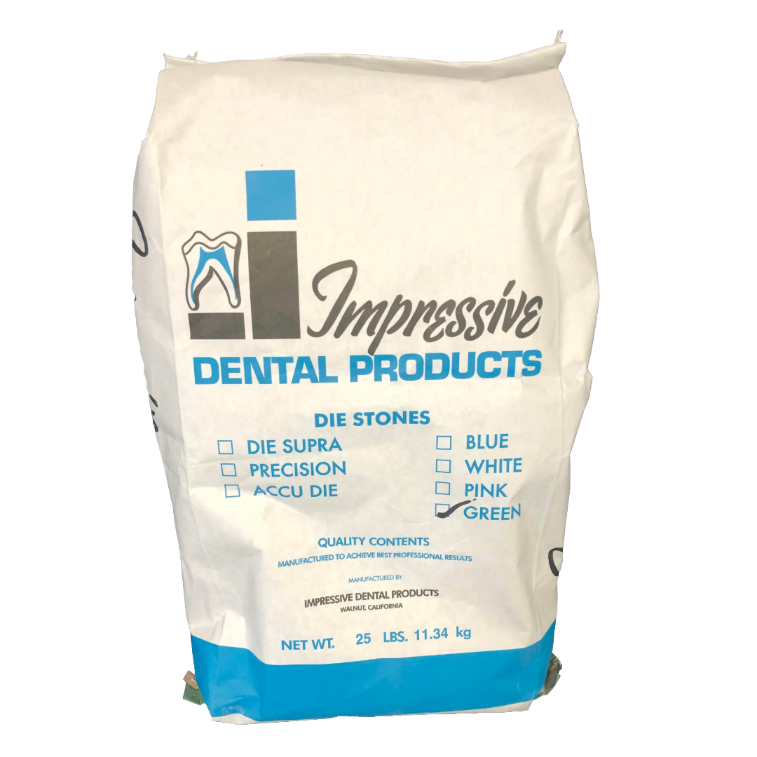 Green Die Stone is the most overall favored color used in the crown and bridge industry : setting time 12 -14 minutes, consistency 20/100 , expansion .0170, and a compressive strength of over 16,000PSI